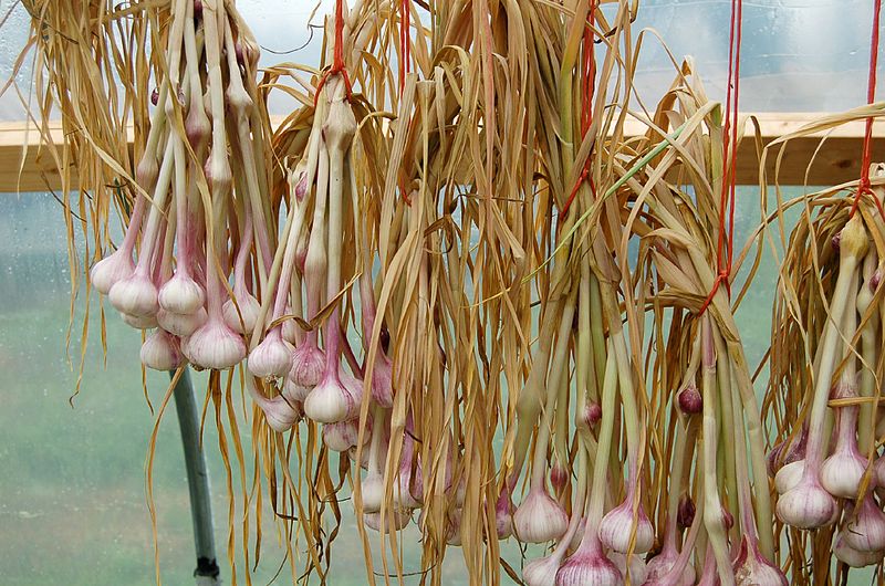 Una vez finalizada la cosecha, los bulbos deben mantenerse en un lugar tibio, soleado y con buena ventilación durante dos o tres semanas, para que se sequen o curen. Suelen curarse con humo que disminuye la pérdida de peso e inhibe parcialmente la germinación. También, para su conservación, los dientes se deshidratan molidos o en escamas.